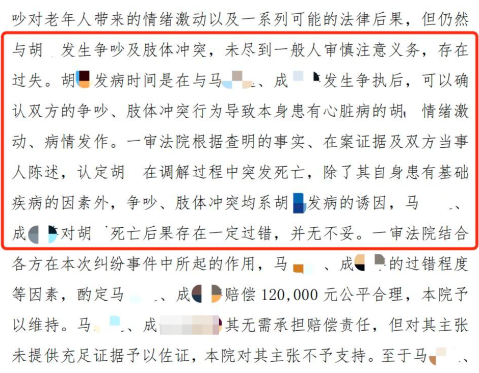 法院认为,胡某在调解过程中突发死亡,除了其自身患有基础疾病的因素外,争吵、肢体冲突均系胡某发病的诱因,马某某、成某某对胡某死亡后果存在一定过错。今年6月底,二审维持原判。